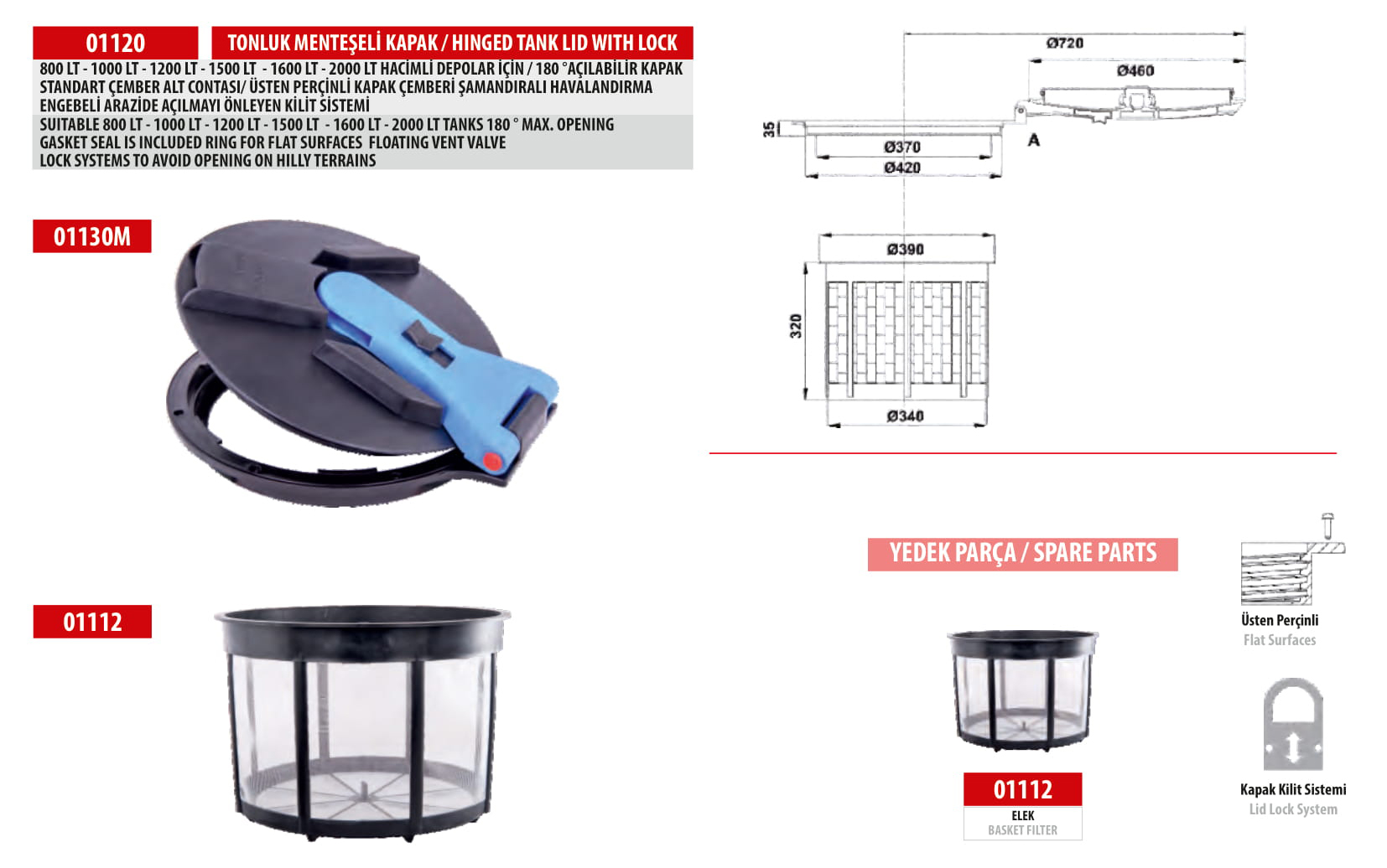 SUITABLE 800 LT - 1000 LT - 1200 LT - 1500 LT - 1600 LT - 2000 LT TANKS 180 ° MAX. OPENING GASKET SEAL IS INCLUDED RING FOR FLAT SURFACES FLOATING VENT VALVE LOCK SYSTEMS TO AVOID OPENING ON HILLY TERRAINS
