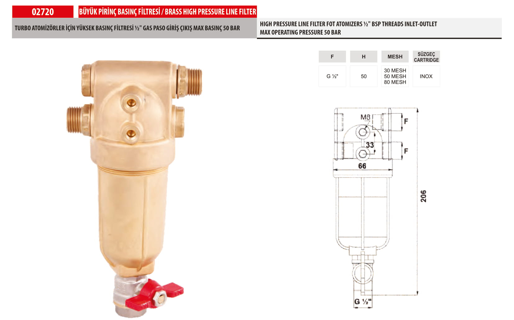 HIGH PRESSURE LINE FILTER FOT ATOMIZERS ½" BSP THREADS INLET-OUTLET